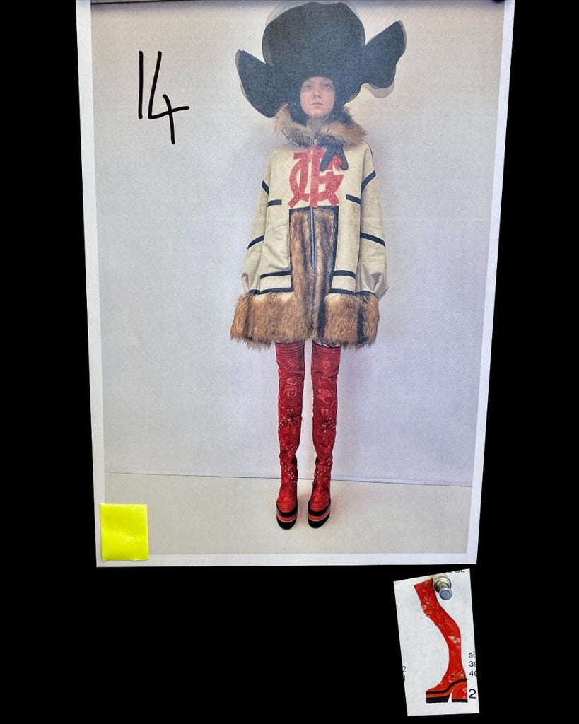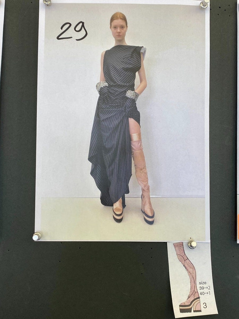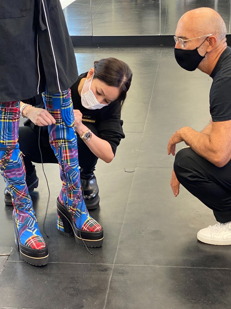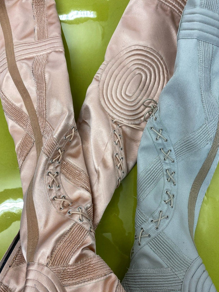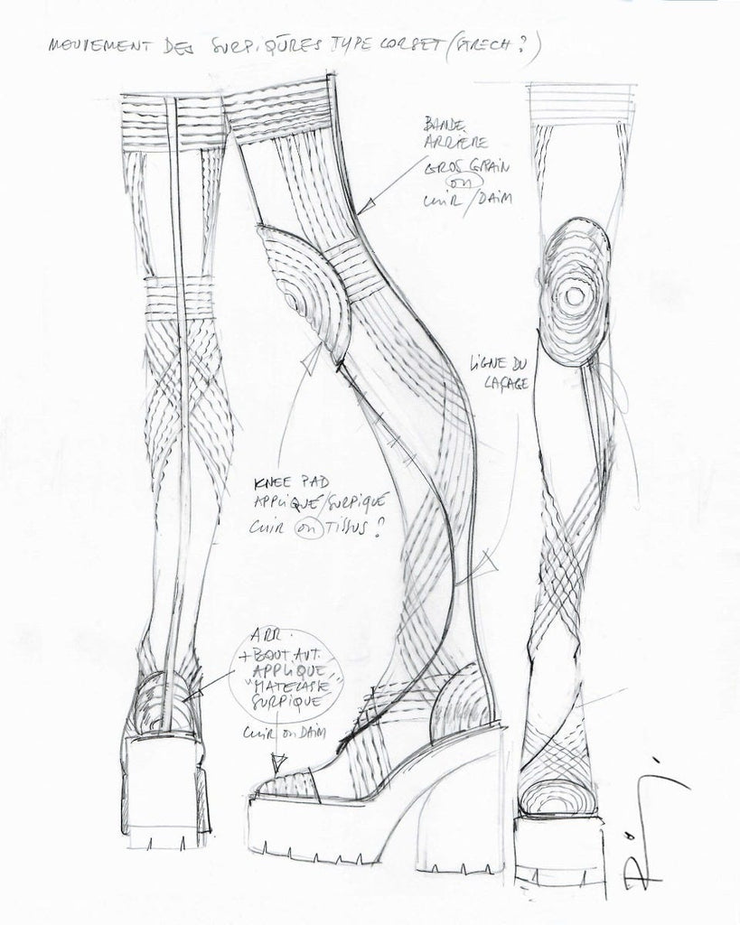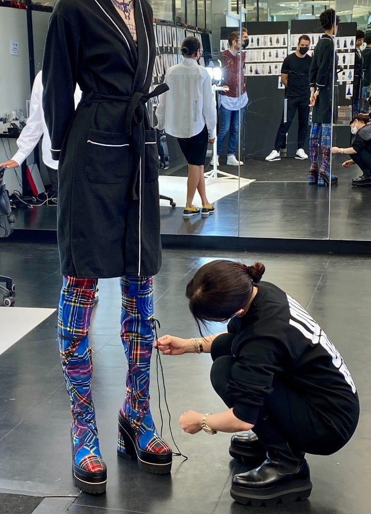 ジャン=ポール・ゴルチエは2021-22年秋冬オートクチュールコレクションの制作をsacai(サカイ)のデザイナーである阿部千登勢に託しました。このコラボレーションをさらに引き立てるために阿部千登勢は長年のパートナーであるピエール アルディを招き、ランウェイのシューズデザインを依頼しました。ブーツ、サンダル、そしてオーバーニーブーツはストレッチやキルティング素材を採用し、ジャン=ポール・ゴルチエの象徴的なコルセットからインスピレーションを得たレースアップのデザインが施されました。