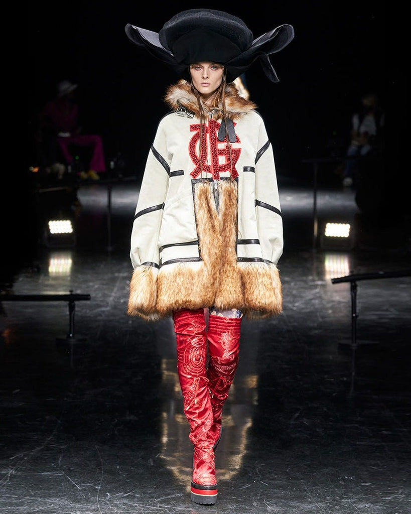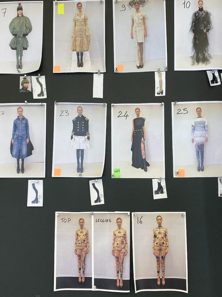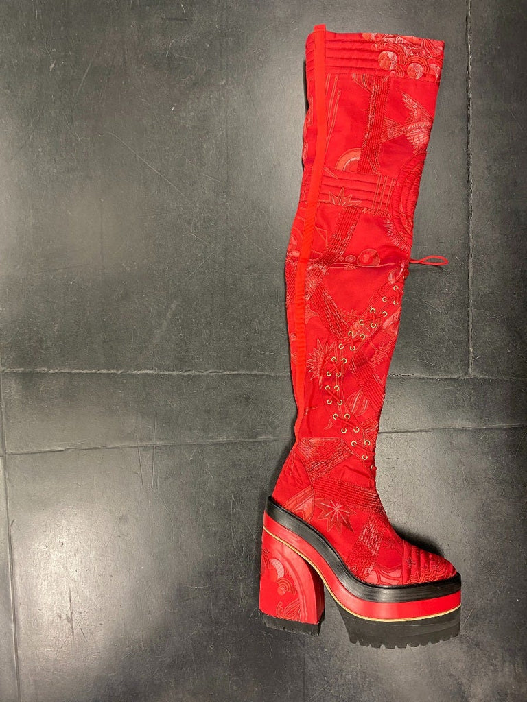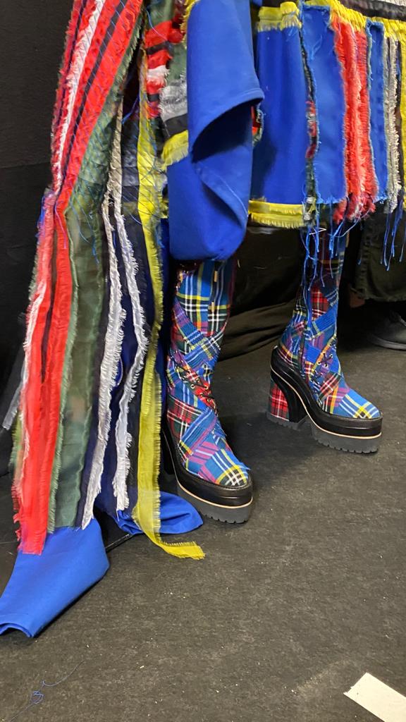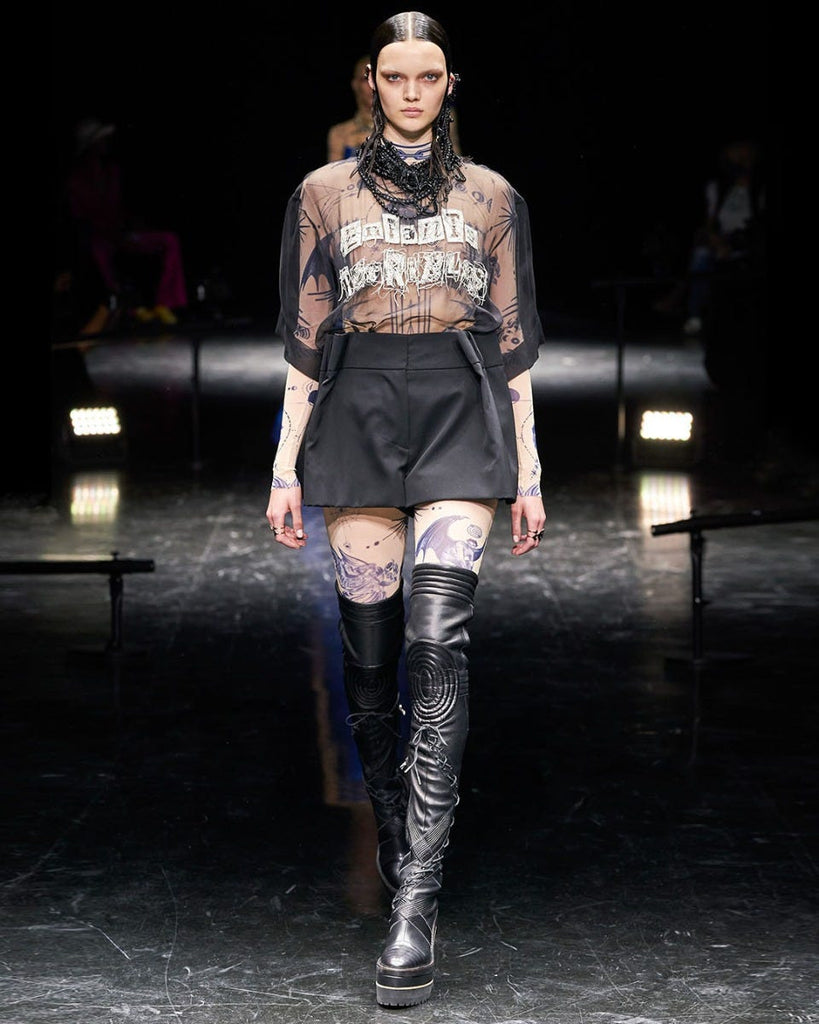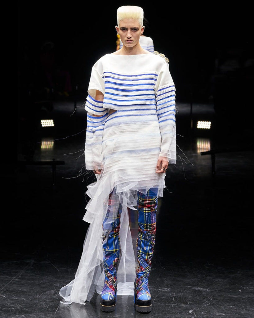 ジャン=ポール・ゴルチエは2021-22年秋冬オートクチュールコレクションの制作をsacai(サカイ)のデザイナーである阿部千登勢に託しました。このコラボレーションをさらに引き立てるために阿部千登勢は長年のパートナーであるピエール アルディを招き、ランウェイのシューズデザインを依頼しました。ブーツ、サンダル、そしてオーバーニーブーツはストレッチやキルティング素材を採用し、ジャン=ポール・ゴルチエの象徴的なコルセットからインスピレーションを得たレースアップのデザインが施されました。