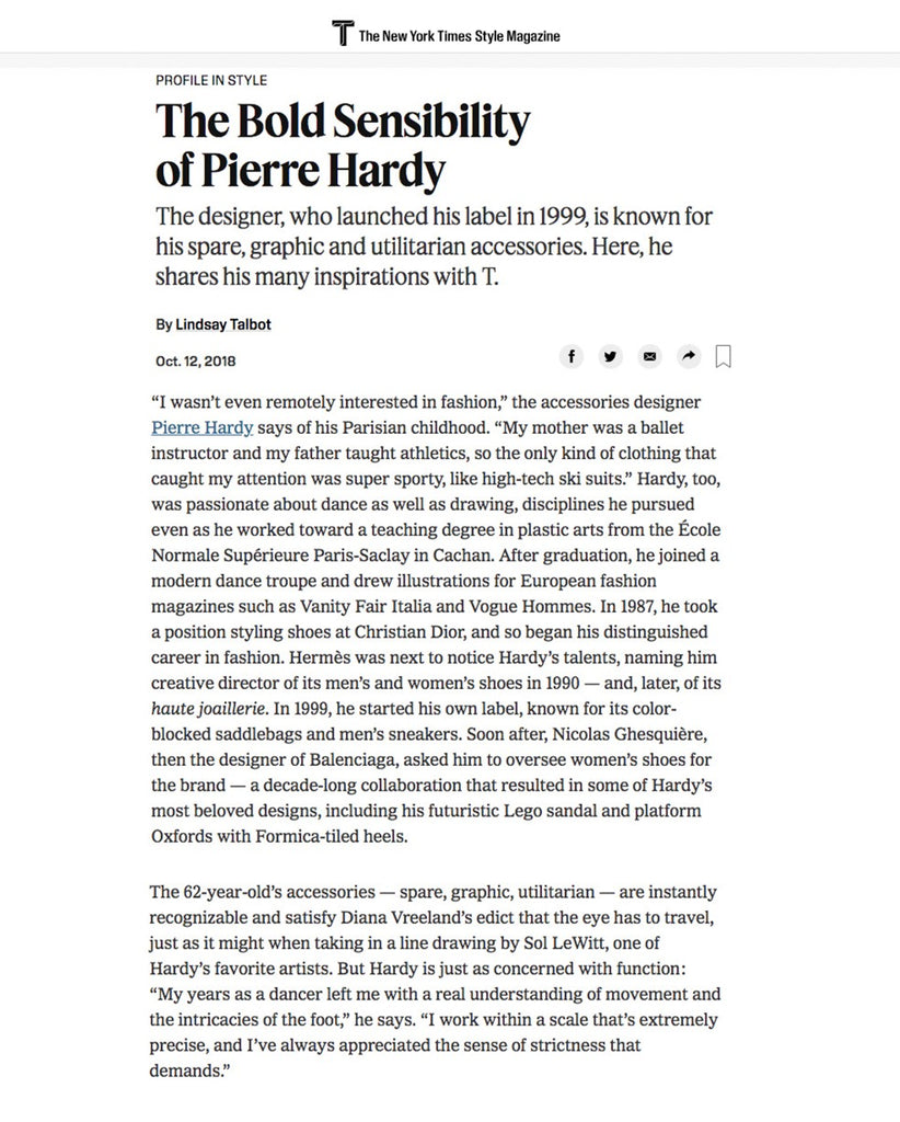 Pierre Hardy talks about inspirations with Lindsay Talbot for october 2018 issue of T Magazine.