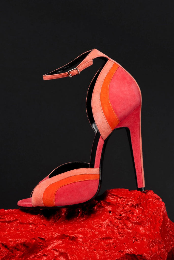 L’approche graphique si spécifique au créateur se traduit par des jeux de rayures de cuir, biais ou découpes contrastées. Ces lignes colorées soulignent la silhouette des modèles, tracent des cercles ou même des fleurs naïves. Sandales, escarpins, ballerines, derbies ou bottines, ... une même dynamique stylistique rythme tous les modèles, peu importe leur forme.