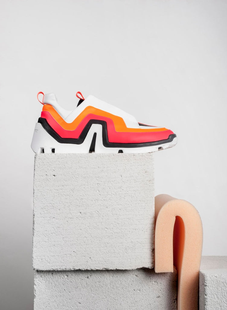 The guiding thread of this collection is the Alpha theme, which appeared last Spring and is declined today through new models : the Alpha Skinny sandal, the Alpha Mega platform low boot and the Cuban heel Alpha Camp boot. These shoes, influenced by the colour and shape reflections favoured by the American minimalist artists, are punctuated by the vibrant coloured stripes. The multi-coloured leather trims on the front of the shoe, the ankle strap or the arch of the foot define the actual structure of the models.