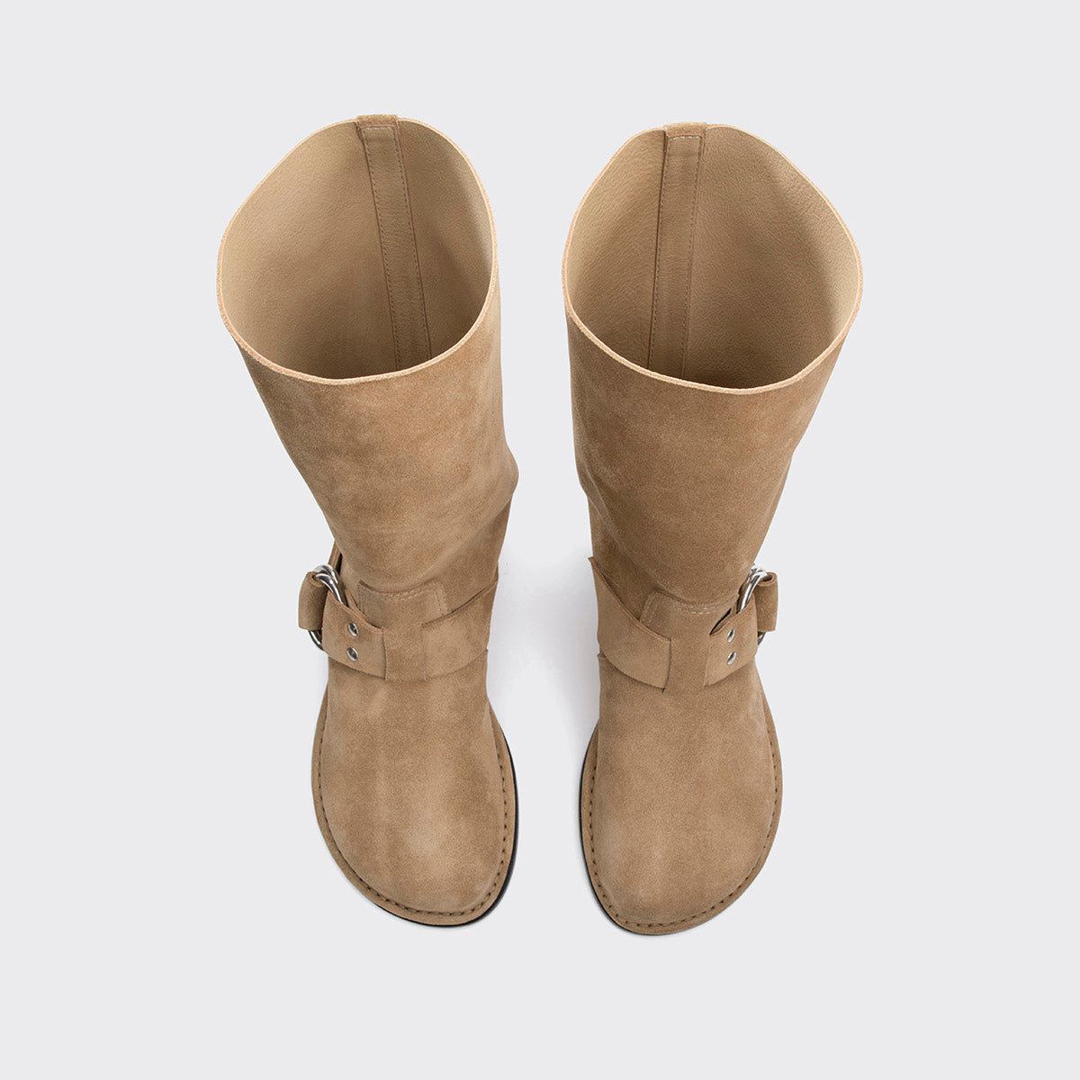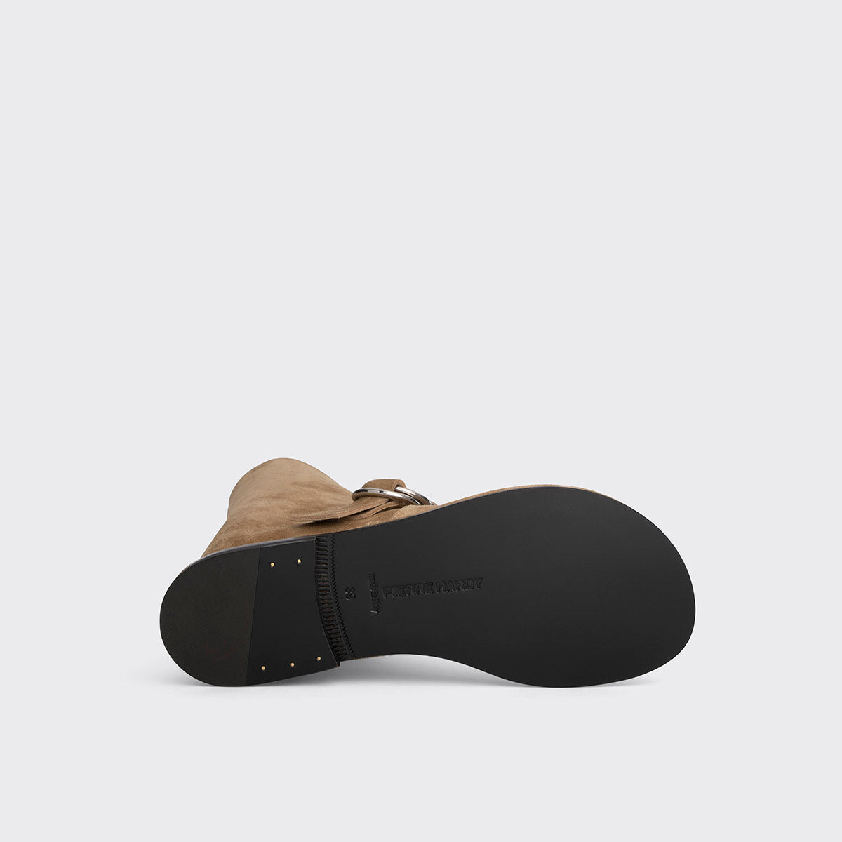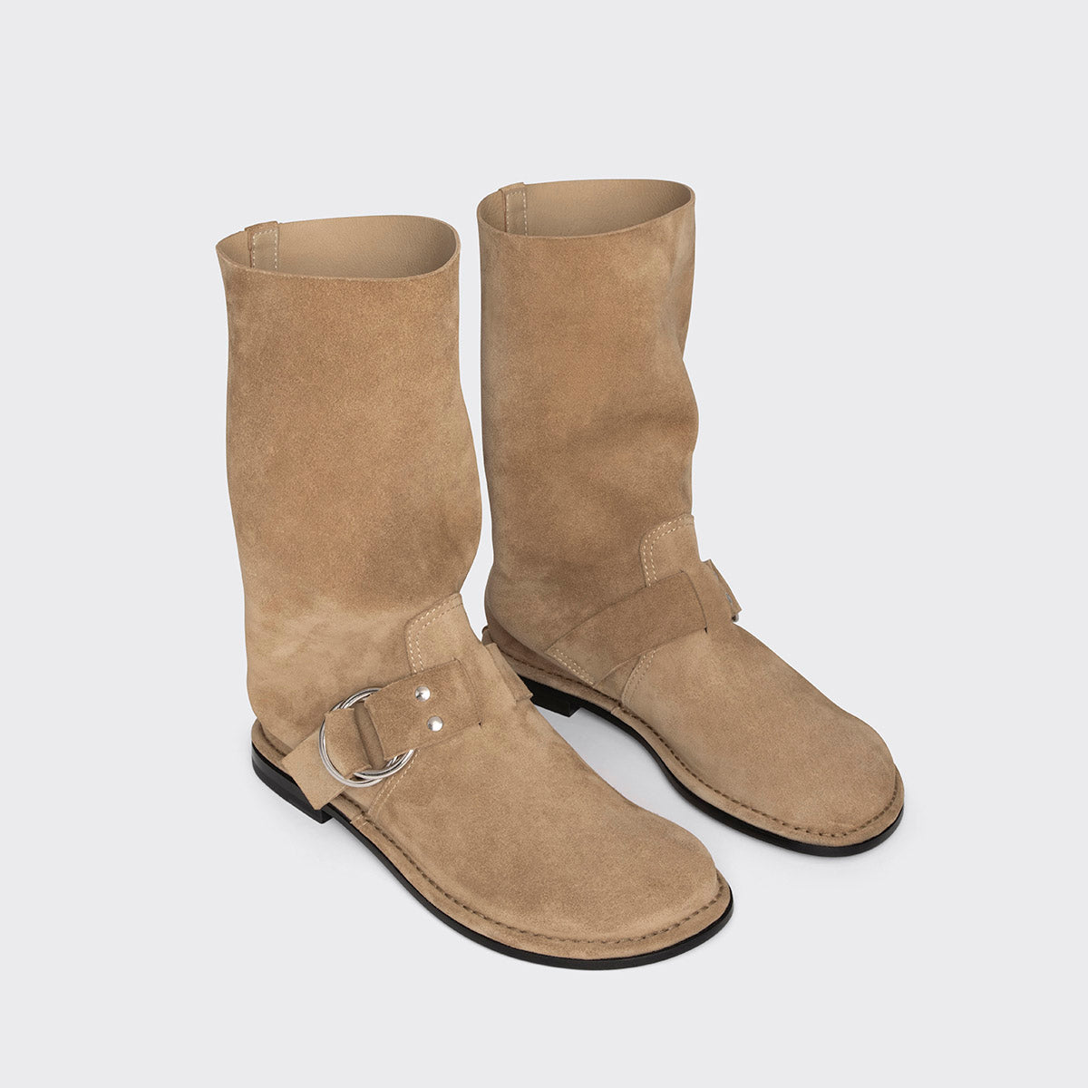 クリステンブーツは、クリステンローファーの洗練されたエレガンスさを、大胆なスタイルでハイカットバージョンに再解釈しました。ブラックレザーまたはサンドスエードカーフスキンを使用し、サンクリスピーノ製法とアナトミカルソールが柔軟性と快適性を確保しています。甲部分にあしらわれたダブルバックルストラップが個性を添えています。