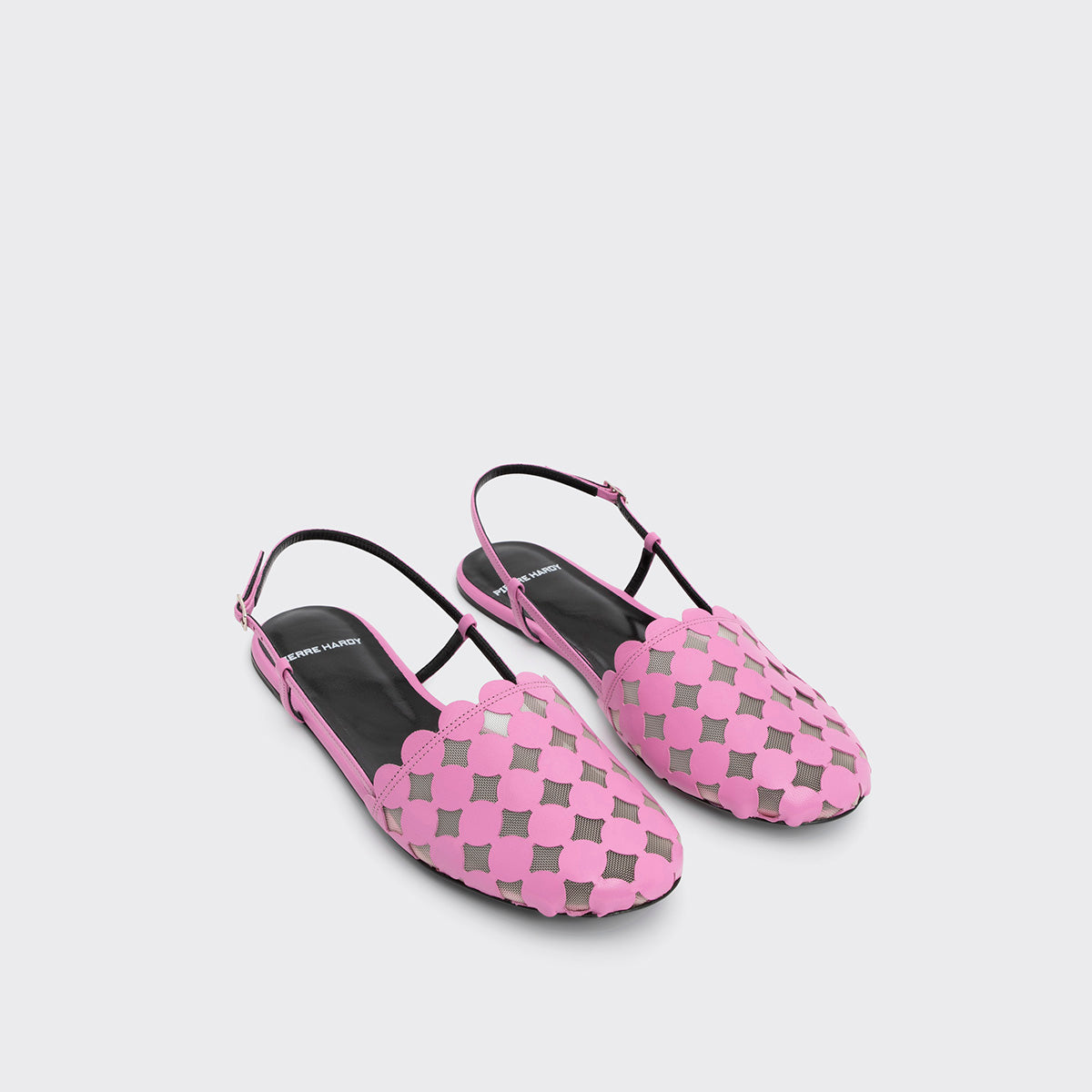 ミニビュルフラットにスリングバックサンダルが登場。チュールの透け感とグラフィックデザインが現代的かつクリーンな印象を演出します。