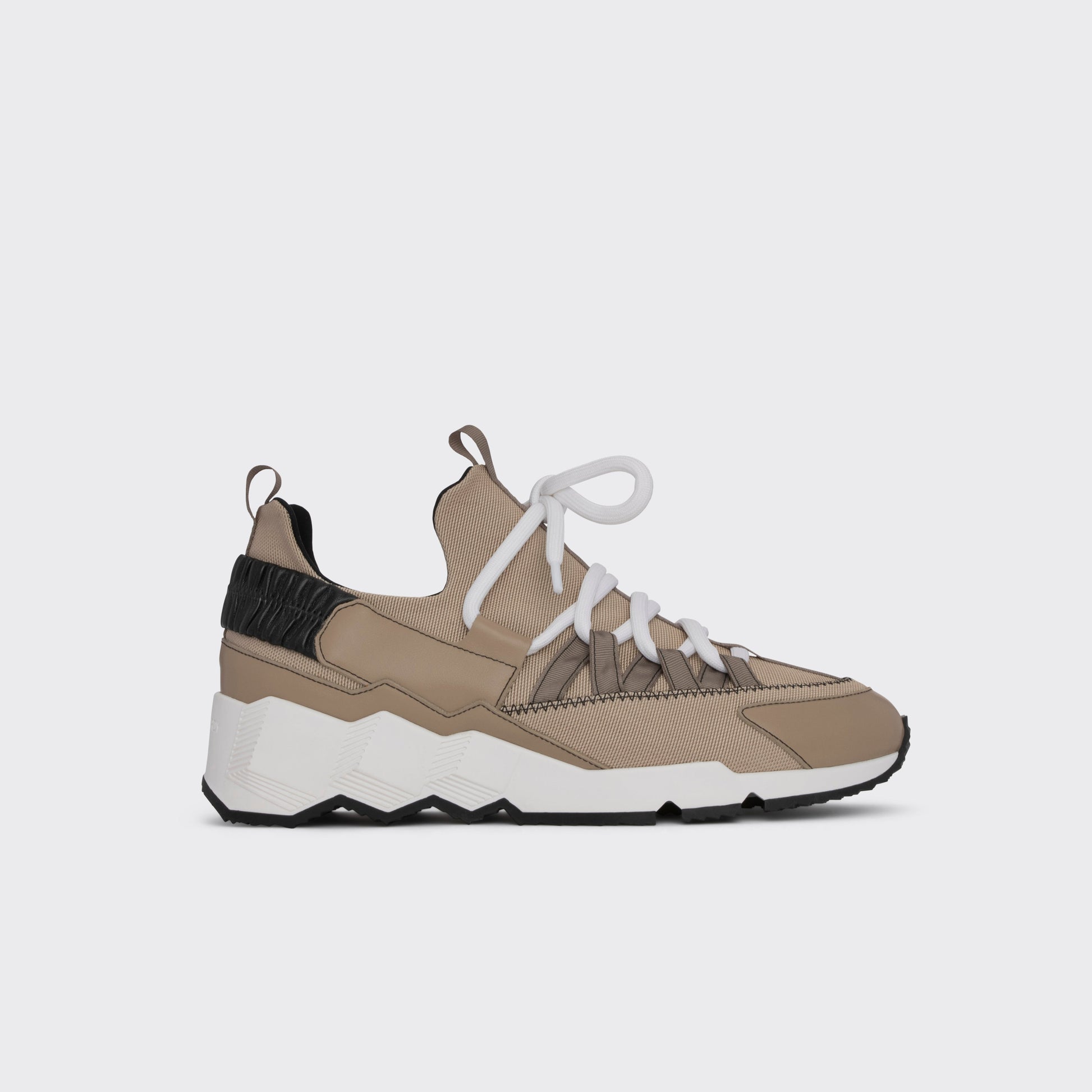 特徴的なキューブ柄をプレスしたソールが目を惹き、後方部のパテントレザーがモード感と遊び心を兼ね備えています。抜群のトラクションと快適な履き心地で、スタイリッシュな外観と機能性を両立します。