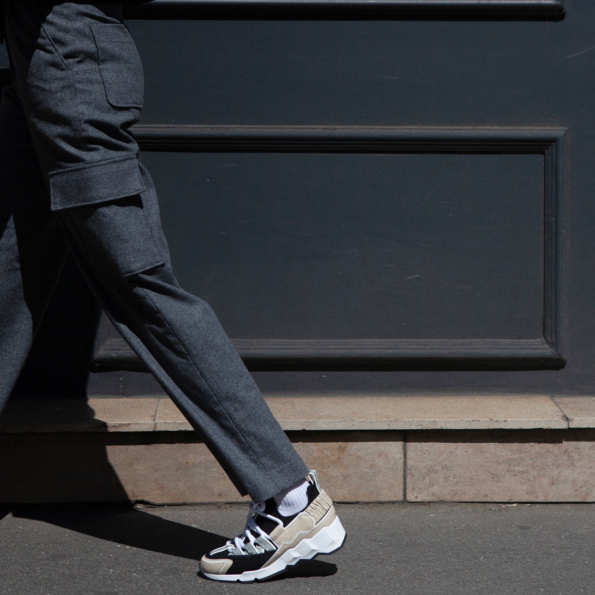 スポーティでありながら洗練されたデザインの「TREK COMET(トレックコメット)」スニーカーは、日々のどのスタイリングにもフィットするパーフェクトな1足です。特徴的なキューブ柄をプレスしたソールが目を惹き、後方部のパテントレザーがモード感と遊び心を兼ね備えています。抜群のトラクションと快適な履き心地で、スタイリッシュな外観と機能性を両立します。
