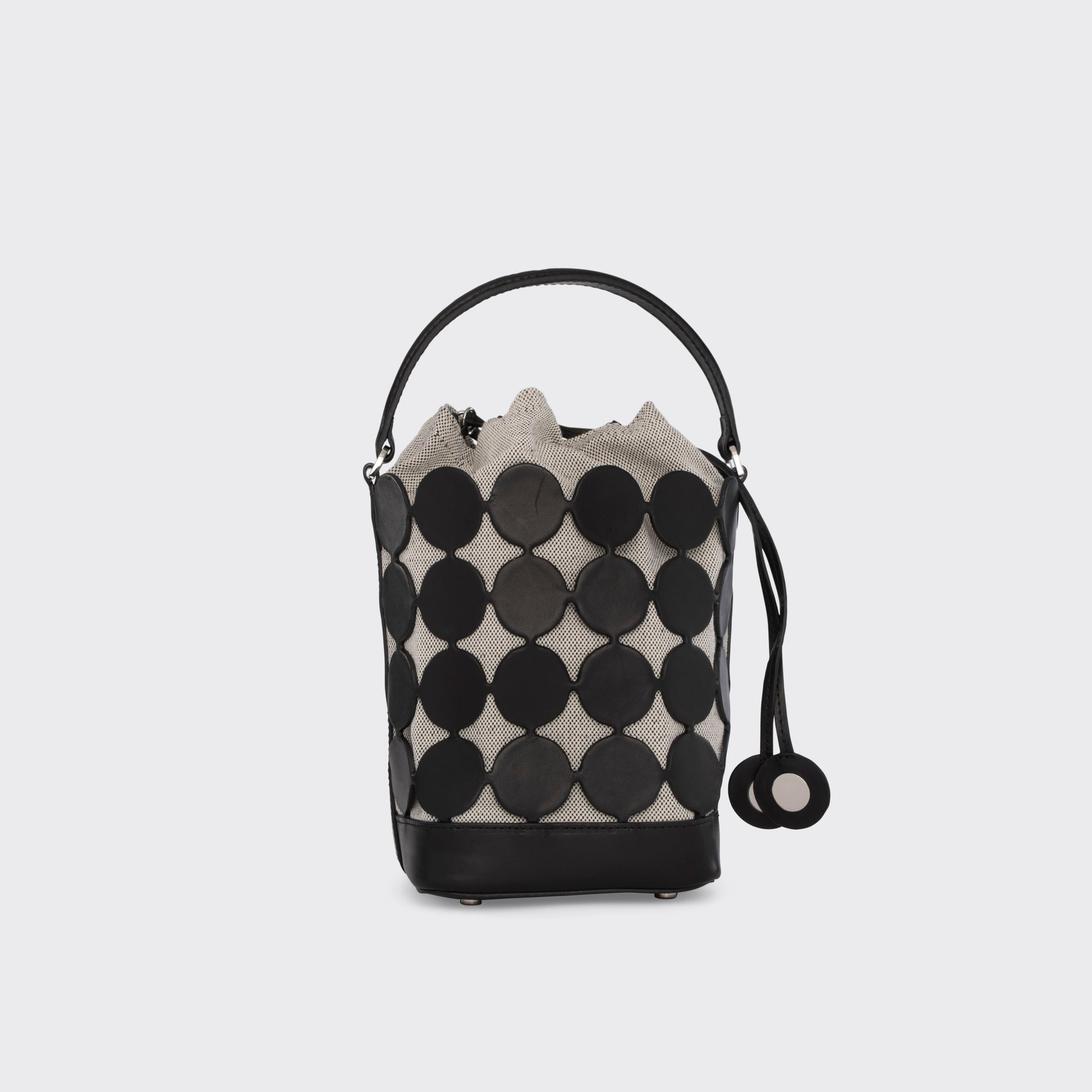 シャンパンの泡をイメージした「ビュル」シリーズのバケットバッグ。グラフィカルな外観と、キャンバスのライニングを使用した軽やかな仕様が特徴的です。安心感のある容量で、ショルダーストラップでクロスボディバッグとしてもスタイリングできます。